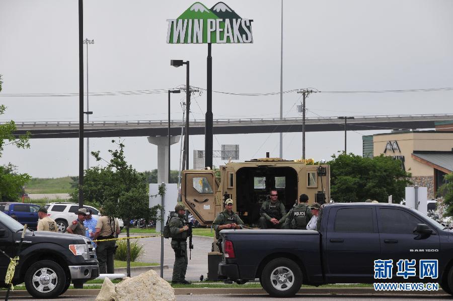 5月18日,在美国得克萨斯州韦科市,荷枪实弹的警察在发生帮派枪战的“双峰”餐厅附近警戒。美国得克萨斯州中部城市韦科一家叫“双峰”的餐厅17日下午因一起摩托车帮派之间的争执而引发枪战,造成9人死亡、至少18人受伤。截至记者发稿时,警方在事发现场的调查仍在继续。 新华社记者 张永兴 摄 图片来源:新华网