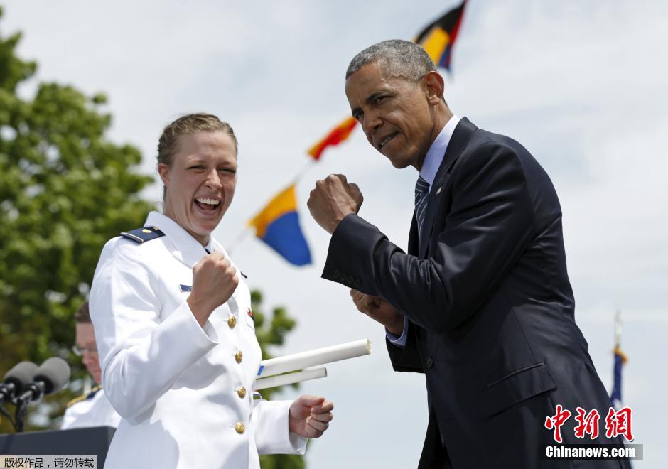 当地时间5月20日,美国总统奥巴马出席了在新伦敦的美国海岸警卫队学院毕业典礼。典礼上与毕业的学员热情互动,摆出各种强硬造型合影。