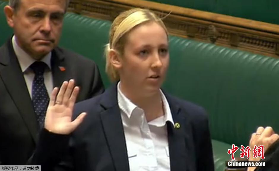 当地时间2015年5月20日,英国伦敦,梅丽·布莱克(Mhairi Black)宣誓就职。这位成功“突袭”的年轻女性名叫梅丽·布莱克是一名大学生,在苏格兰格拉斯哥附近Paisley and Ranfrewshire South选区获胜,成为了自1667年以来,英国最年轻的国会议员。