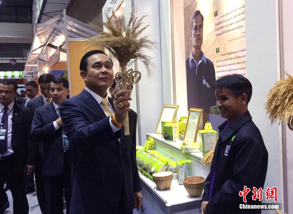 5月20日,2015泰国大米会议在曼谷开幕。泰国总理巴育出席会议并发表主题演讲。巴育表示,今年泰国降雨量比往年减少30%,泰国将从生产、育种、耕地开发、种植技术等方面出台可持续性政策和促进措施,加强与老挝、缅甸、越南、柬埔寨等东盟国家的合作,力促在东盟内部开展反倾销合作。大米占泰国农产品出口比重的七成。2014年,泰国出口大米1090万吨,是世界第一大米出口国。图为巴育与稻农交流。中新社发 黄艳梅 摄