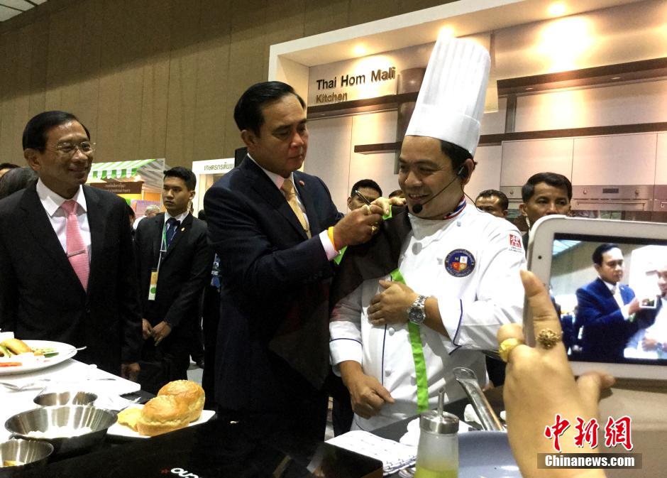 5月20日,2015泰国大米会议在曼谷开幕。泰国总理巴育出席会议并发表主题演讲。巴育表示,今年泰国降雨量比往年减少30%,泰国将从生产、育种、耕地开发、种植技术等方面出台可持续性政策和促进措施,加强与老挝、缅甸、越南、柬埔寨等东盟国家的合作,力促在东盟内部开展反倾销合作。大米占泰国农产品出口比重的七成。2014年,泰国出口大米1090万吨,是世界第一大米出口国。图为巴育推销泰国大米。中新社发 黄艳梅 摄