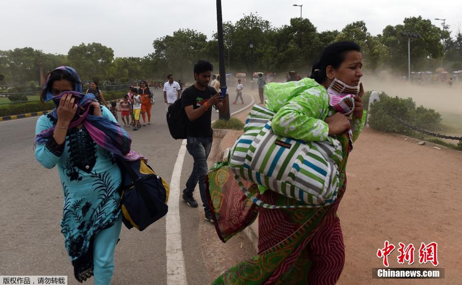 当地时间2015年5月19日,印度新德里遭遇沙尘暴袭击,漫天黄沙飞扬。