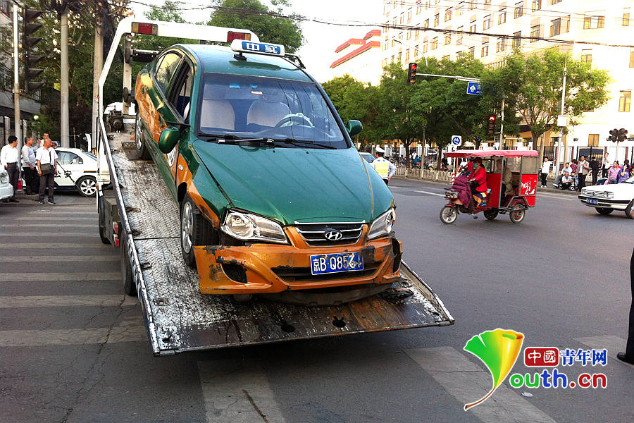 疯狂肇事出租车被拖上拖车。 中国青年网记者 隗功臣 摄