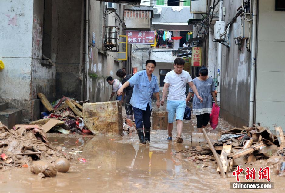 5月20日,福建宁化城区民众正在清理自家门前的垃圾和淤泥。19日,福建闽西北地区宁化、清流、长汀等地普降暴雨,县城内涝严重,被淹城区一片狼藉。中新社发 张斌 摄
