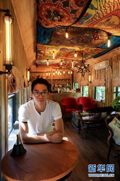 5月20日,在大连理工大学南门“旅途之生”火车主题创业街,创业者宋冠明在自己经营的“浮游酒吧”内待客。新华社发(张春雷 摄)图片来源:新华网