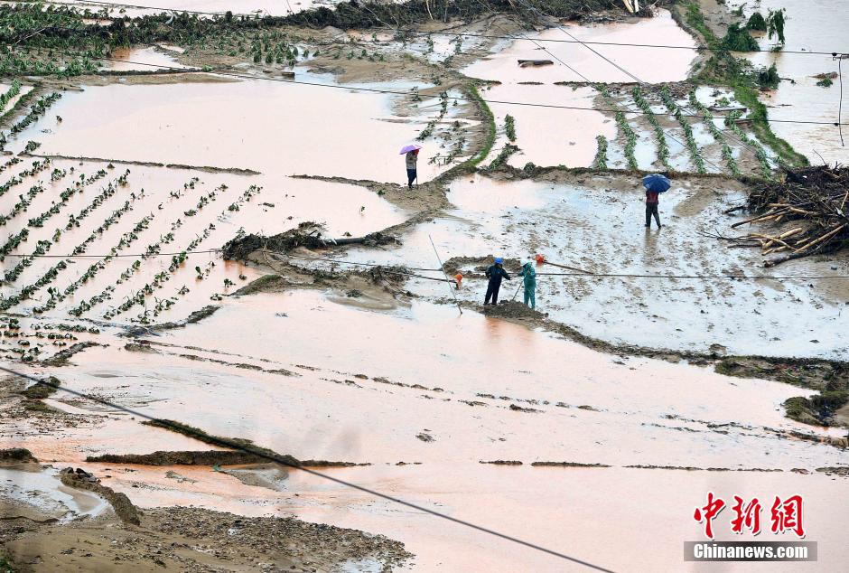 5月21日,福建宁化许多乡镇农田种植的经济作物洪水冲毁。当日,福建省防汛办发布的数据显示,此次暴雨过程已造成福建7人遇难、1人失踪。5月18日到19日,福建西北部地区持续暴雨到大暴雨,三明市宁化、清流县城区三分之一被淹,龙岩市长汀县多个乡镇发生洪涝灾害。20日,随着主雨区南移,福建西部、南部地区发生暴雨。福建省防汛办披露,截至20日19时统计,福建有三明、龙岩、泉州、南平4个设区市、20个县(市、区)、185个乡镇24.2万人受灾,紧急转移4.1万人,农作物受灾21.3千公顷,倒塌房屋0.249万间,直接经济总损失20.87亿元人民币。中新社发 张斌 摄