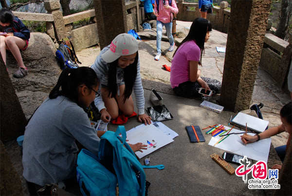 把教学课堂搬到黄山大自然中,让孩子们在大自然放飞心情。在黄山曙光亭处,孩子们像是放飞的小鸟,心情舒畅,脸上写满了欢乐,似乎有说不完的话,有时还做着小游戏。通过孩子们眼睛所见的秀峰、山峦、奇松、怪石、山花,用诗的语言进行描绘,以绘画的形式进行创作。