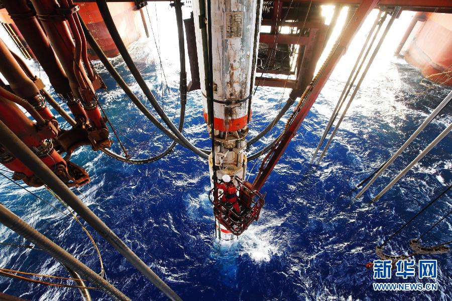 中国海洋石油总公司“海洋石油981”钻井平台的工人在安装水下防喷器控制电缆卡子(2014年10月14日摄)。2015年4月初,“海洋石油981”深水钻井平台顺利完成海外首口深水井钻井作业,完钻井深超过5030米,创造了亚洲深水半潜式钻井平台作业井深新纪录,也迈出中国深水高端装备走出国门、参与国际市场角逐的重要一步。新华社发(赵亮摄)