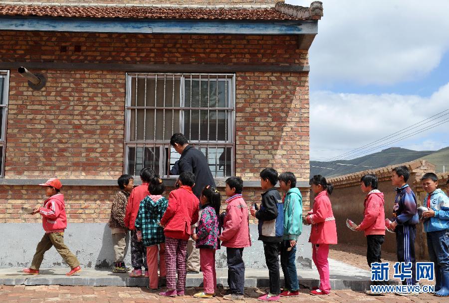 5月21日,在宁夏回族自治区西吉县震湖乡党岔小学,孩子们在领取免费营养午餐。近日,记者从宁夏回族自治区教育厅了解到,从2015年春季学期开始,宁夏逐步将农村义务教育学生营养改善计划膳食标准由每天4.6元提高到5.6元,惠及28万农村义务教育学生和独立设置特殊教育学校学生。新华社记者 彭昭之 摄