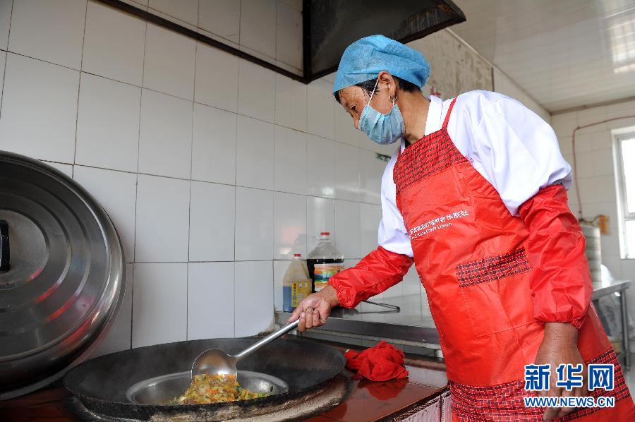 5月21日,在宁夏回族自治区西吉县震湖乡党岔小学,学生食堂的专职厨师正在为学生制作免费营养午餐。近日,记者从宁夏回族自治区教育厅了解到,从2015年春季学期开始,宁夏逐步将农村义务教育学生营养改善计划膳食标准由每天4.6元提高到5.6元,惠及28万农村义务教育学生和独立设置特殊教育学校学生。新华社记者 彭昭之 摄