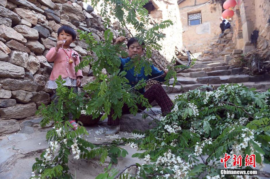 5月19日,山西省盂县大汖村,当地原住民拾掇刚采下来的槐树花,为驻地游客准备土饭。武俊杰 摄