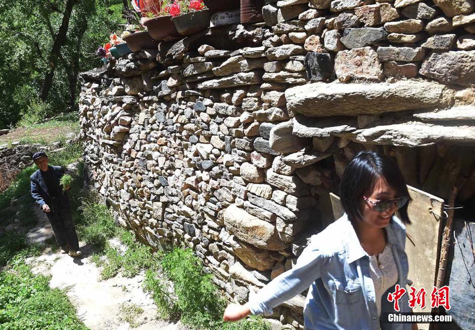 5月19日,山西省盂县大汖村,时尚游客与原住民穿行在同一石墙下。 武俊杰 摄