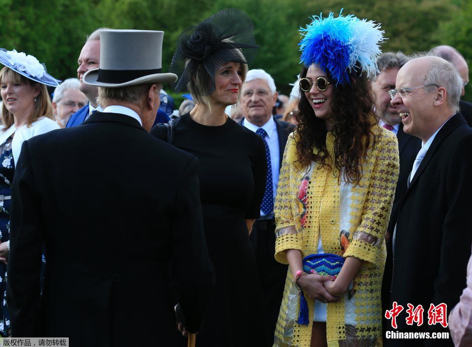 图为在派对上,菲利普亲王(左)与英国女歌手Eliza Doolittle交谈。
