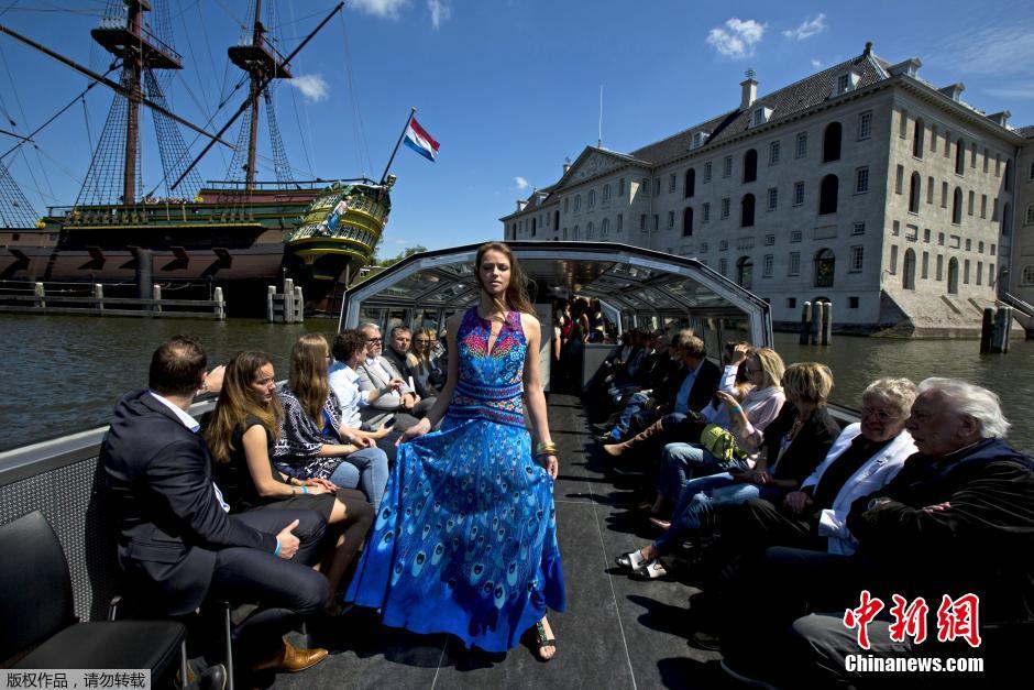 2013年5月21日,荷兰阿姆斯特丹举办“漂浮时装周”,模特游船上走秀引围观。