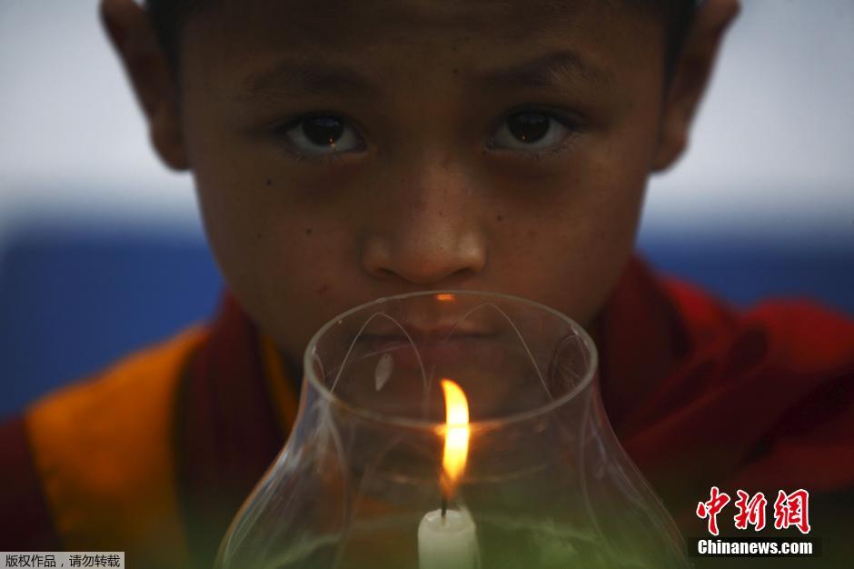 当地时间2015年5月20日,尼泊尔加德满都,尼泊尔僧人手持蜡烛,在震区进行烛光集会,为亡灵超度。图为一名小僧侣手捧烛灯。