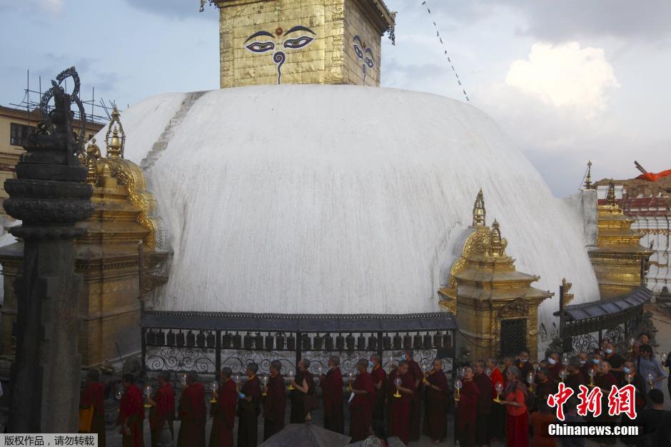 图为尼泊尔僧人手持蜡烛,在斯瓦扬布纳特寺外绕行。
