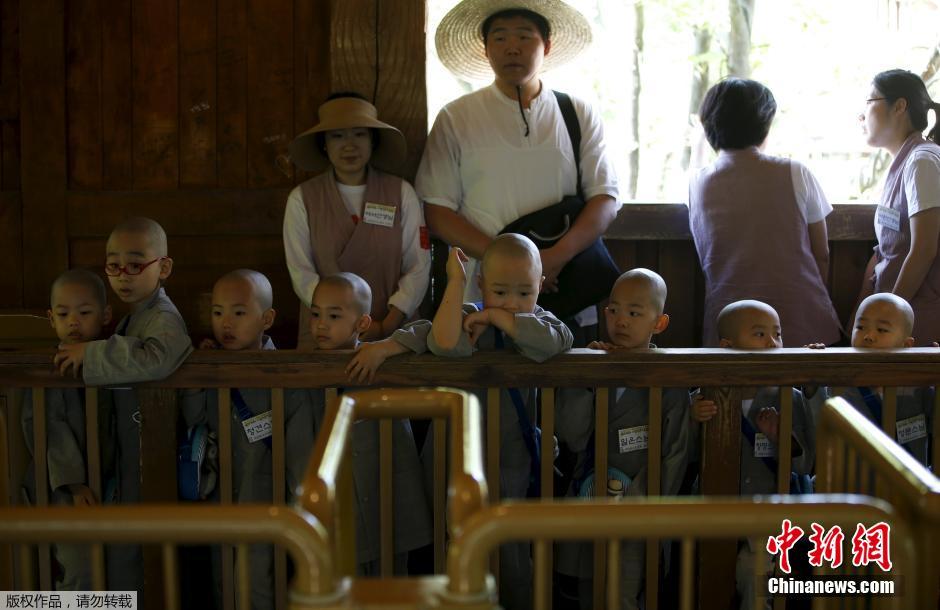 当地时间2015年5月21日,韩国佛诞节,小和尚们排队坐上游乐园的过山车,一脸期待萌翻众人。