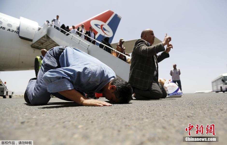 当地时间2015年5月20日,也门萨那,约200名滞留埃及的也门公民抵达萨那国际机场与亲人团聚。官员表示,未来几天会有更多公民返国。图为回国的也门公民下飞机后伏地祷告。