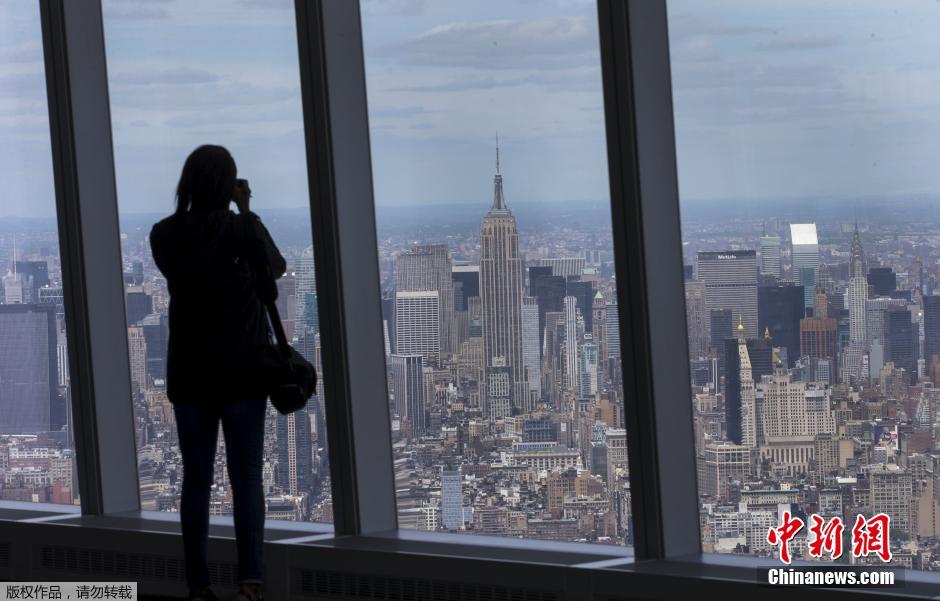 当地时间2015年5月20日,美国纽约,纽约世贸中心观景台开放媒体预览,该观景台将于5月29日对公众正式开放。图为一名参观者在观景台上拍摄照片。