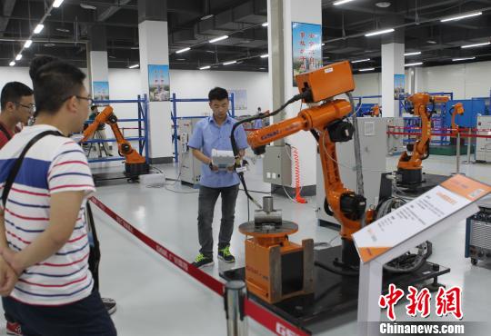 图为工作人员正在给即将出厂的工业机器人做最后的调试。 周毅 摄