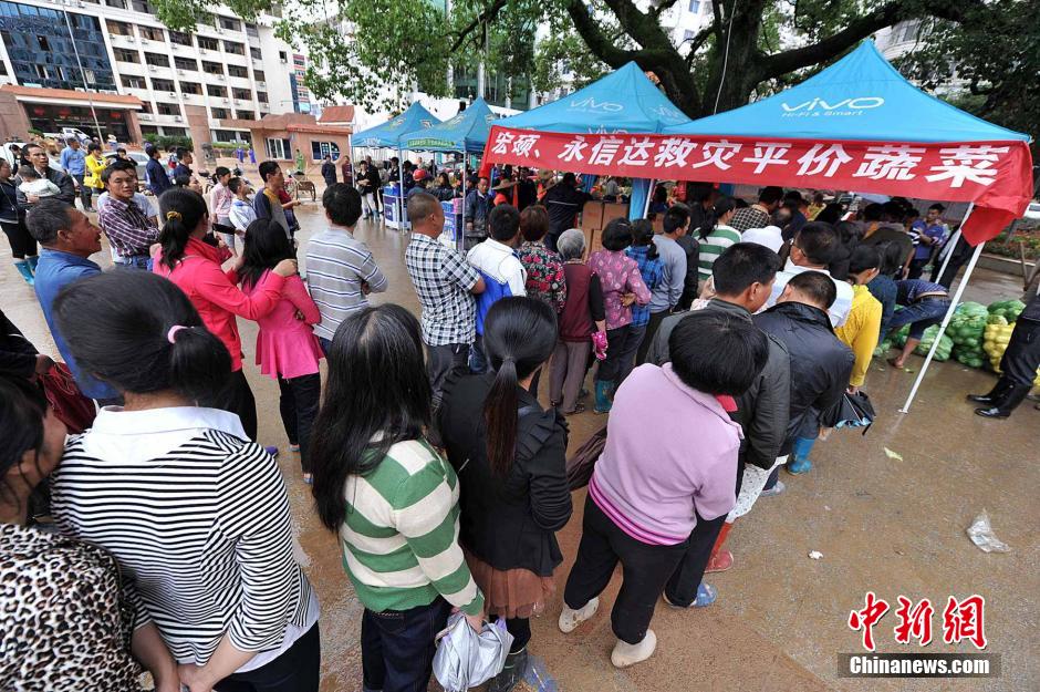5月21日,由宏硕、永信达两家闽台农业生态公司联手在在福建清流县政府前销售每天供应一万斤,每斤一元的平价蔬菜,吸引了许多市民前来购买。5月18日到19日,福建西北部地区持续暴雨到大暴雨,三明市宁化、清流县城区三分之一被淹,给民众的生产生活带来了极大不便。张斌 摄