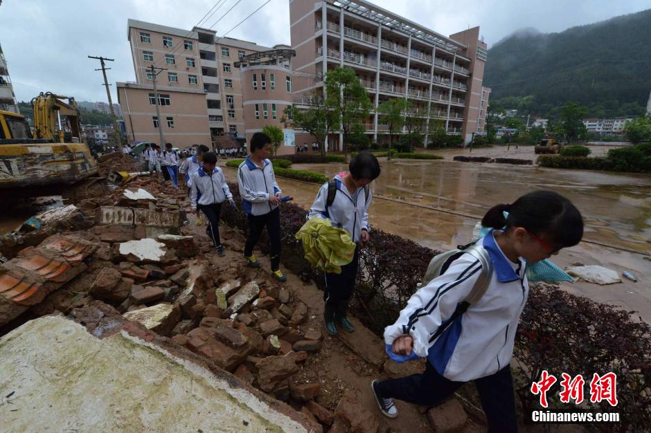 5月21日,下课后的高三学生走出被淹的校区回家。张斌 摄