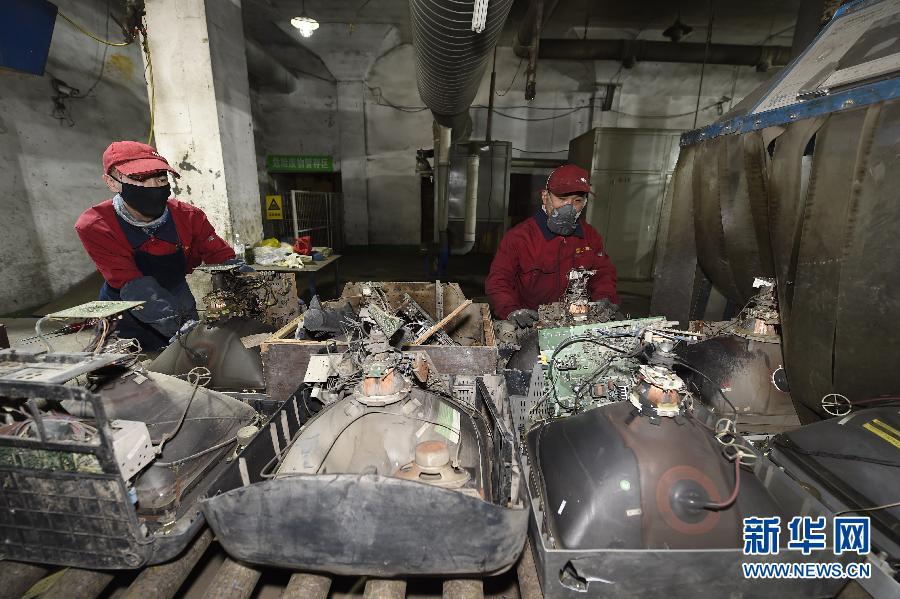 在山西省阳泉市天元循环经济园区的车间,工人在拆解废旧电视机(5月13日摄)。新华社记者 燕雁摄 图片来源:新华网