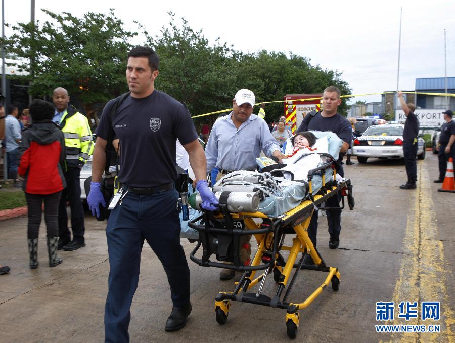 5月24日,在美国休斯敦的龙卷风受灾现场,救援人员运送一名伤者。当日凌晨,美国休斯敦部分地区遭受龙卷风袭击,造成十余间房屋受损,多人受伤。 新华社发(宋穹摄)