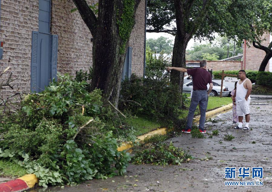 5月24日,在美国休斯敦的龙卷风受灾现场,当地居民站在被吹断的树枝旁。当日凌晨,美国休斯敦部分地区遭受龙卷风袭击,造成十余间房屋受损,多人受伤。 新华社发(宋穹摄)