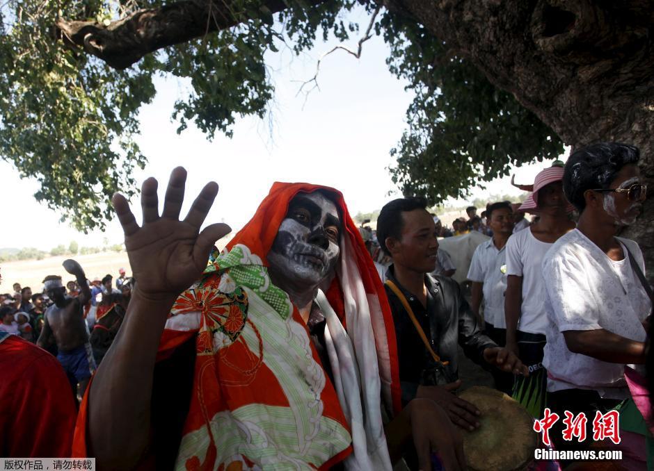 当地时间2015年5月22日,柬埔寨金边,数百村民用颜料涂抹身体,祈求好运与雨水。