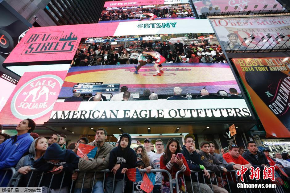 2015年5月21日,美国纽约,一场美国与古巴的摔跤比赛在纽约时代广场上演,现场大屏幕同步直播众人围观。