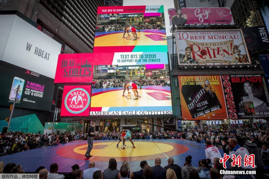2015年5月21日,美国纽约,一场美国与古巴的摔跤比赛在纽约时代广场上演,现场大屏幕同步直播众人围观。