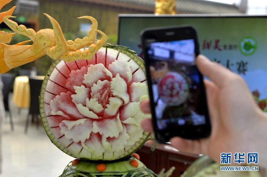 5月25日,在第27届北京大兴西瓜节的“西瓜创意美食大赛”上,一名参观者用手机拍摄西瓜雕刻作品。当日,“第27届北京大兴西瓜节”在北京大兴区庞各庄镇举行。本届西瓜节包括“西瓜创意美食大赛”和“全国西甜瓜擂台赛”两个比赛,分别比拼西瓜宴的设计、西瓜的雕刻工艺和西瓜甜瓜的甜度。新华社记者 高健钧 摄