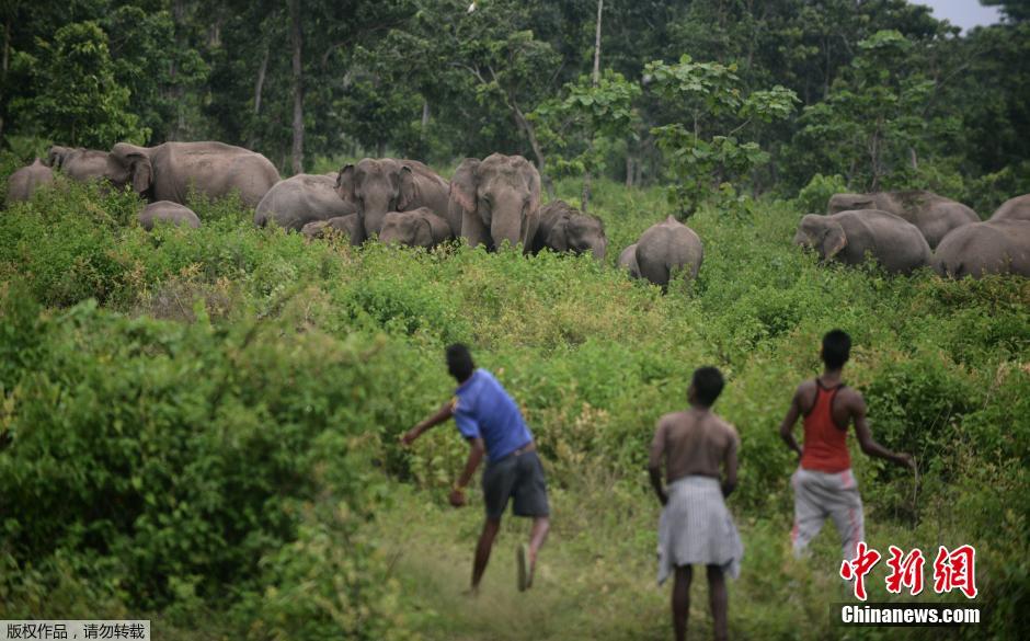 当地时间2015年5月25日,印度Kolabari,象群在村庄附近活动,引民众围观。印度护林员和村民使用鞭炮或石子驱赶村庄附近的象群。村民侵占大象栖息地导致当地人象冲突加剧。