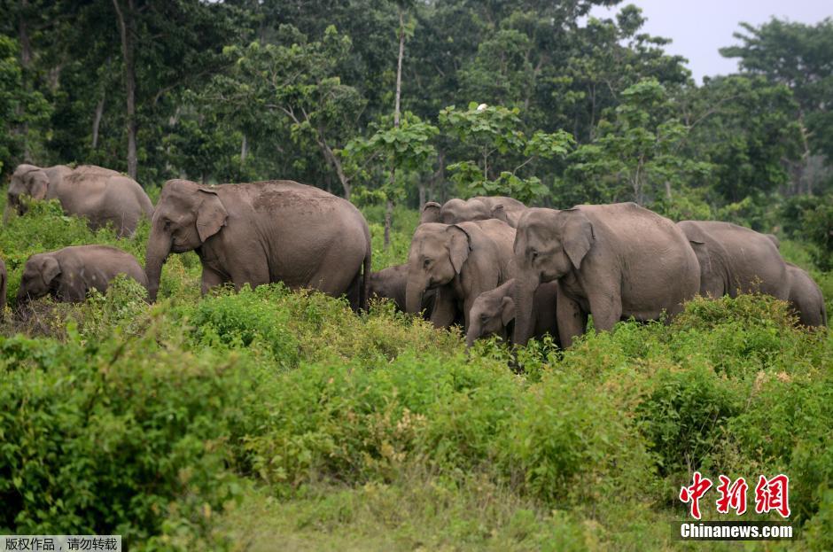 当地时间2015年5月25日,印度Kolabari,象群在村庄附近活动,引民众围观。印度护林员和村民使用鞭炮或石子驱赶村庄附近的象群。村民侵占大象栖息地导致当地人象冲突加剧。