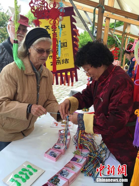 5月18日-24日,“柏林亚太周 感知中国”活动在德国首都柏林举办。由北京市政府新闻办和东城区共同主办的“地坛文化庙会”成为柏林亚太周最大亮点。图为北京民间工艺大师米灵珠向宾客介绍“吉庆有余”、“吉祥如意”、“一路顺风”等各种造型的中国结。韩旭 摄