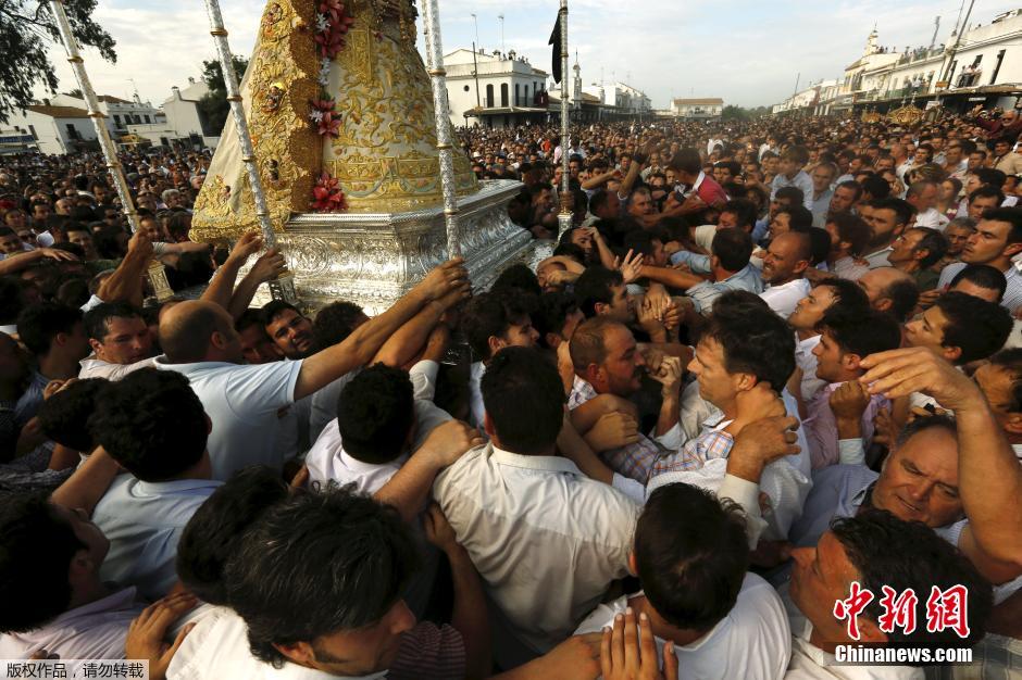 当地时间2015年5月25日,西班牙阿尔蒙特,人们在一年一度的朝圣之旅中抬着圣女埃尔罗西奥(Virgin of El Rocio)的圣像穿过大街小巷,当地信众争相触摸。