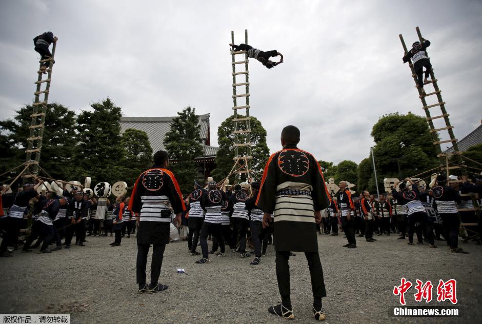 当地时间2015年5月25日,日本浅草,数百名消防队员身穿传统消防员衣服在浅草寺参加已故消防员追思会。