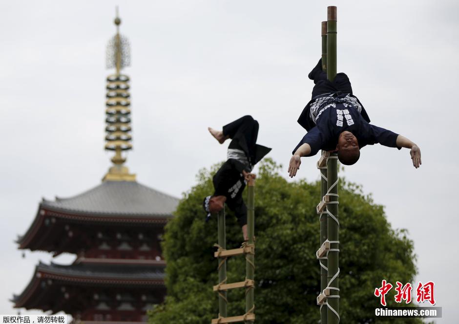 当地时间2015年5月25日,日本浅草,数百名消防队员身穿传统消防员衣服在浅草寺参加已故消防员追思会。
