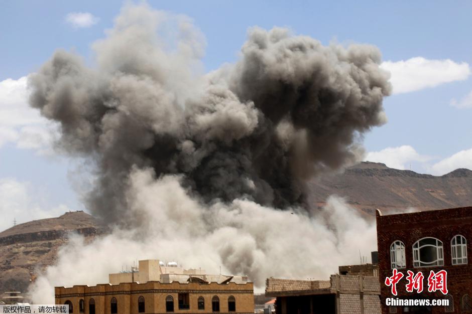 当地时间2015年5月24日,也门萨那,以沙特为主导的联军持续空袭胡塞武装的军事基地,现场浓烟滚滚。
