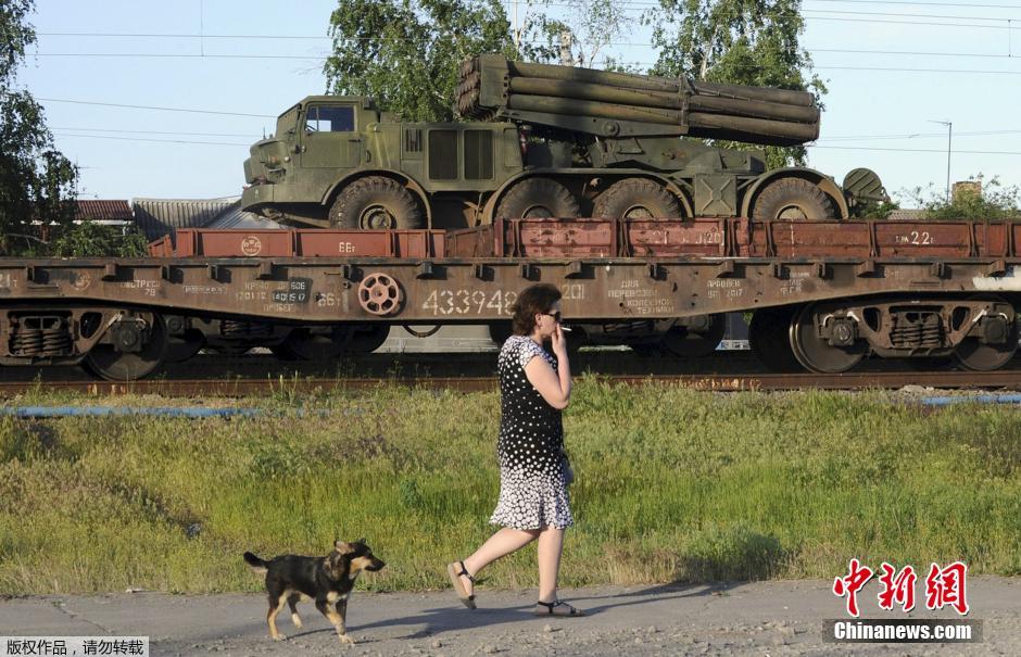 当地时间2015年5月24日,俄罗斯罗斯托夫,数十辆军事车辆抵达俄罗斯乌克兰边境地区。据了解,车队共有包括飓风火箭炮、无牌照卡车和装甲车。