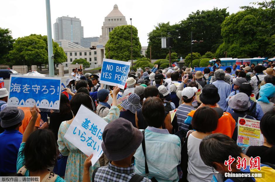 当地时间2015年5月24日,日本东京,示威者包围日本国会大厦,抗议美军在冲绳建设新的军事基地。