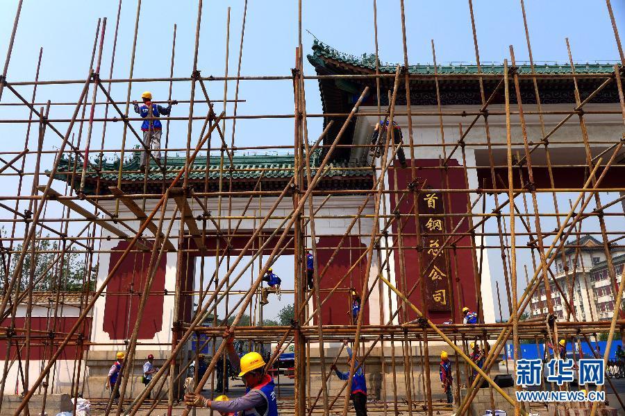 5月25日,施工人员在首钢厂东门搭建脚手架。新华社发 李文明 摄 图片来源:新华网