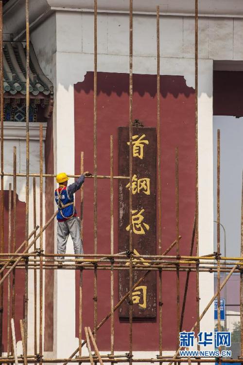 5月25日,施工人员在首钢厂东门搭建脚手架。新华社发 傅纯荣 摄 图片来源:新华网