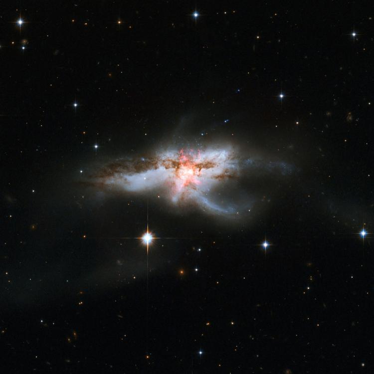 这一形状奇特的星系并非一开始就是这样。它的外观,是2个星系过于靠近、发生合并的结果。此次合并引发了新的恒星形成,并导致许多炙热的年轻恒星爆发。(图片来源:美国宇航局/欧洲航天局)