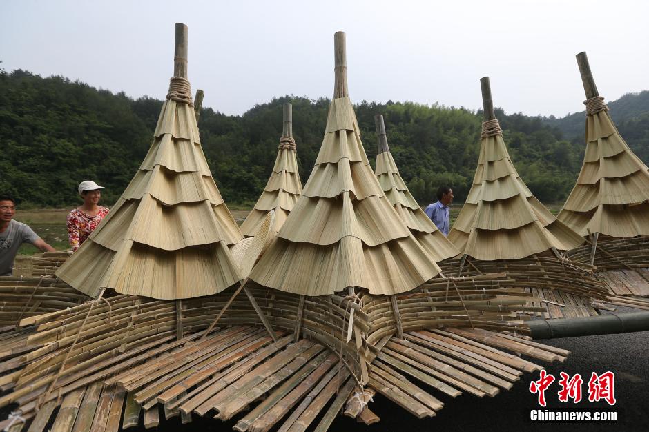 5月25日,东南大学大学生为即将完工的鸭寮(鸭子住的棚子)做最后的收尾。从5月15日开始,30多位来自南京东南大学建筑学院的大学生们走进浙江临安太阳公社,携带设计好的竹材模型,用真实的竹子材料在稻田内搭建鸭寮,以实用为基础,将小小的鸭鹏建造的极具创意和想象力,为朴素的农田增添了一道独特的风景。中新社发 泱波 摄