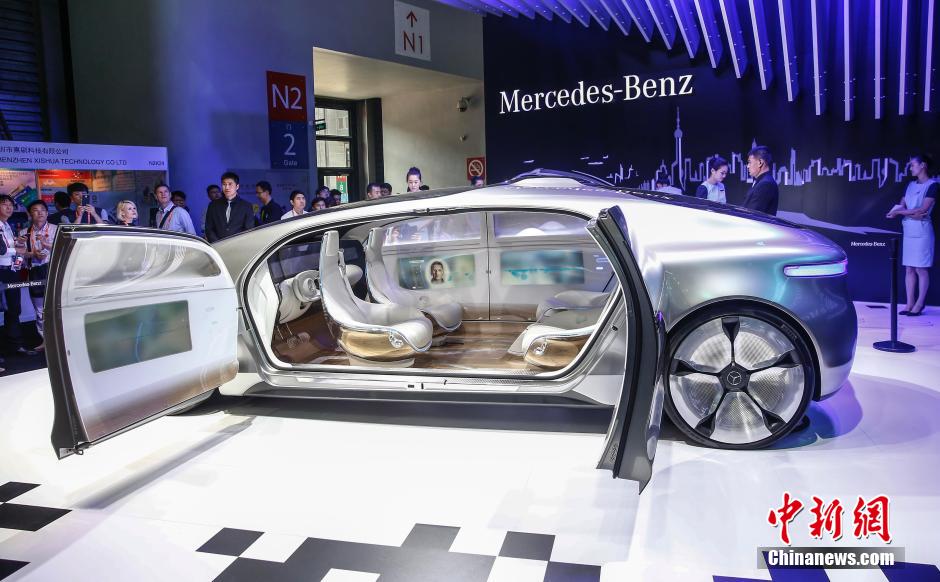 5月25日,首届CES亚洲消费电子展(CES Aisa)在上海开幕,这是在拉斯维加斯举办的美国CES展会首次来到亚洲,图为奔驰F 015 Luxury in Motion自动驾驶概念车展出。车内没有实体控制按钮,乘客可以通过手势、眼神追踪或触屏的方式来直观地与联网的汽车互动,仅仅是通过简单的挥手或眼球转动,便可控制汽车的一举一动。中新社发 张浩 摄