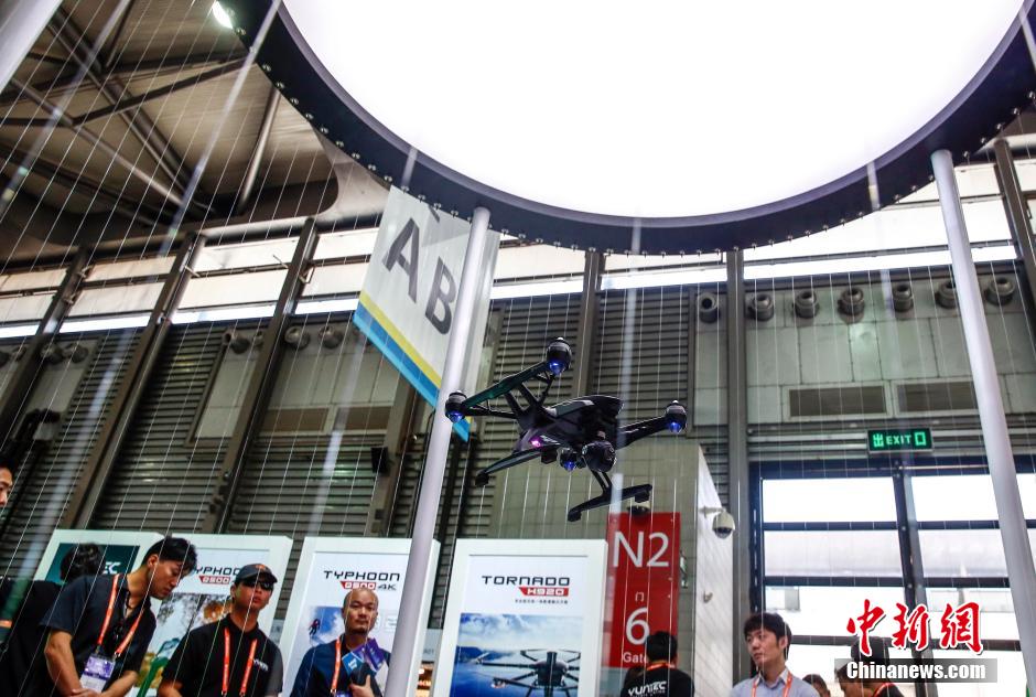 5月25日,首届CES亚洲消费电子展(CES Aisa)在上海开幕,这是在拉斯维加斯举办的美国CES展会首次来到亚洲,图为观众观看无人机展台。CES Asia会议议程涵盖可穿戴设备、数字健康、机器人、物联网和未来消费技术市场等主题。展览展区总面积为2万多平方米,容纳大约200位参展商。中新社发 张浩 摄