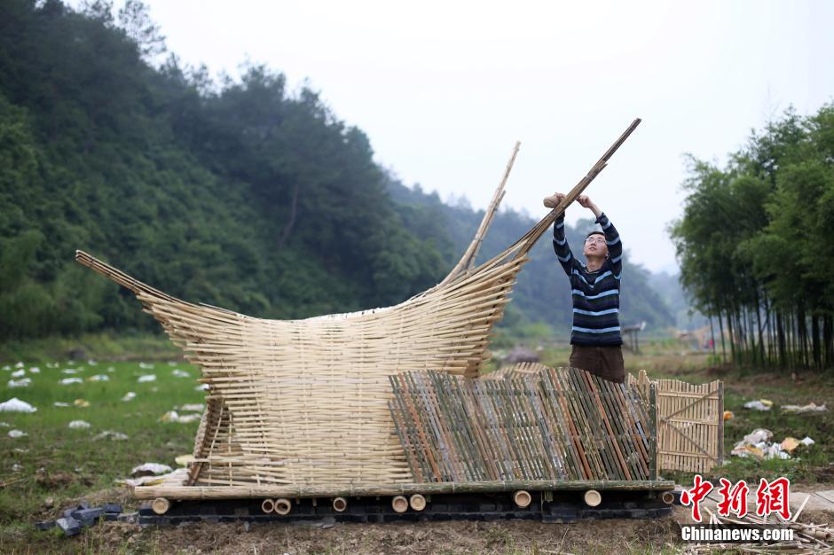 5月25日,东南大学大学生为即将完工的鸭寮(鸭子住的棚子)做最后的收尾。从5月15日开始,30多位来自南京东南大学建筑学院的大学生们走进浙江临安太阳公社,携带设计好的竹材模型,用真实的竹子材料在稻田内搭建鸭寮,以实用为基础,将小小的鸭鹏建造的极具创意和想象力,为朴素的农田增添了一道独特的风景。中新社发 泱波 摄