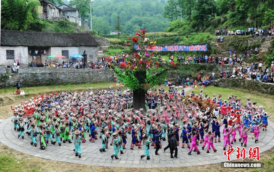 5月25日,2015年中国·凤凰苗族“四月八”跳花节在湖南凤凰苗族生态文化保护核心区山江镇举行。近万苗家人身着盛装,跳着原生态的舞蹈,为当地民众和游客呈现了一场民族特色的文化视听盛宴。据悉,“四月八”是苗族人聚会欢庆的重大传统节日,2011年入选第三批国家级非物质文化遗产名录。杨华峰 摄